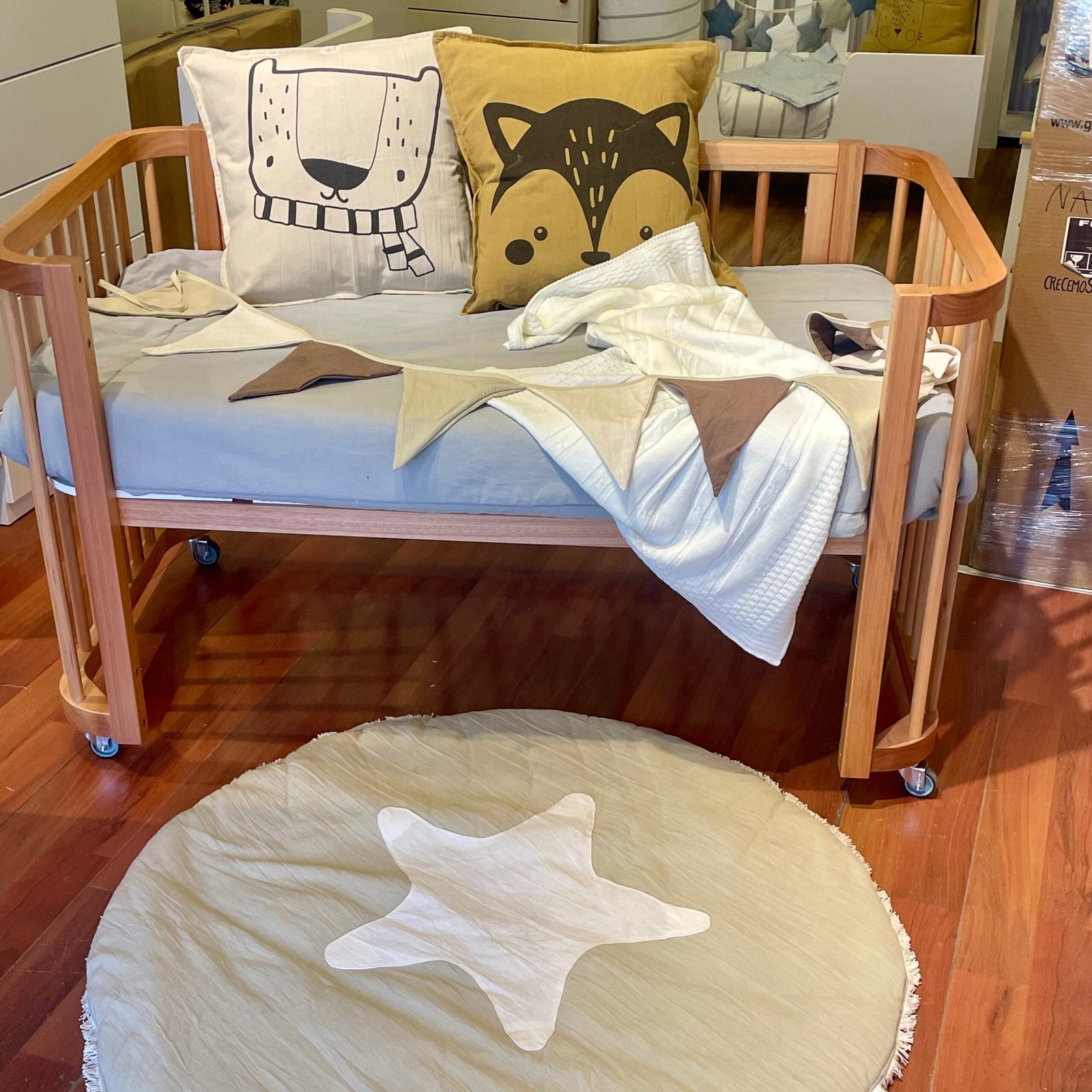 Playmat de 1,20 m de diám, bien mullida, con base impermeable y flecos en su perímetro. Apta para el juego del bebé tanto dentro como fuera de la casa. Es muy usada para deco -No pasa frío ni humedad- Excelente calidad y buen gusto67